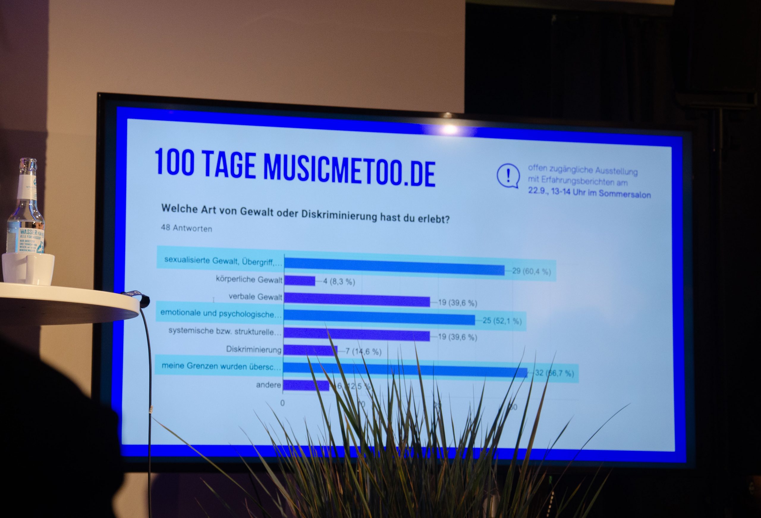 Seit den Vorwürfen gegen Rammstein-Frontmann Till Lindemann 2023 haben wir unser Engagement gegen Gewalt und Machtmissbrauch in der Musikbranche verstärkt. Gemeinsam mit Aktivist*innen und Vereinen thematisierten wir die strukturellen Probleme der Branche in Medien und Diskussionsformaten. In Kooperation mit musicmetoo.de entwickelten wir eine Ausstellung mit anonymisierten Betroffenenberichten, die u.a. auf dem Reeperbahn Festival 2023 und dem Wellemachen Festival 2024 gezeigt wurde. Die Ausstellung wurde auch von anderen Veranstaltenden übernommen. Auf Basis freiwilliger Angaben der Betroffenen veröffentlichten wir Auswertungen und Magazinbeiträge.